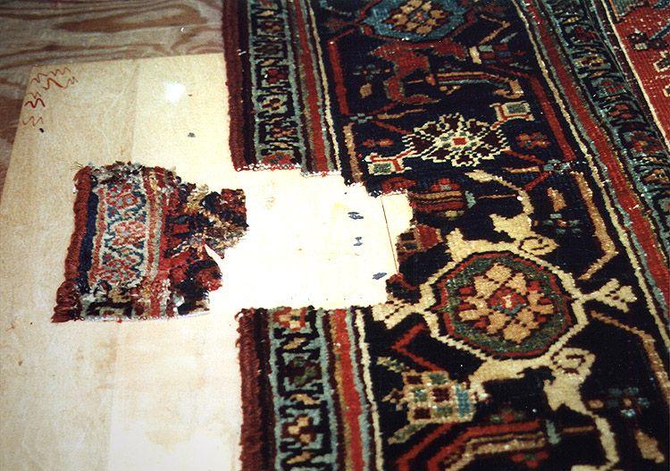 That’s what happened with this Heriz. I cut and removed that piece as you can see in the picture. Usually I have to remove and cut a larger area than the actual section to get to a clean and strong edge. This margin is even bigger in the case of water rots. Water can penetrate few more inches into the rug out of actual rot circle.